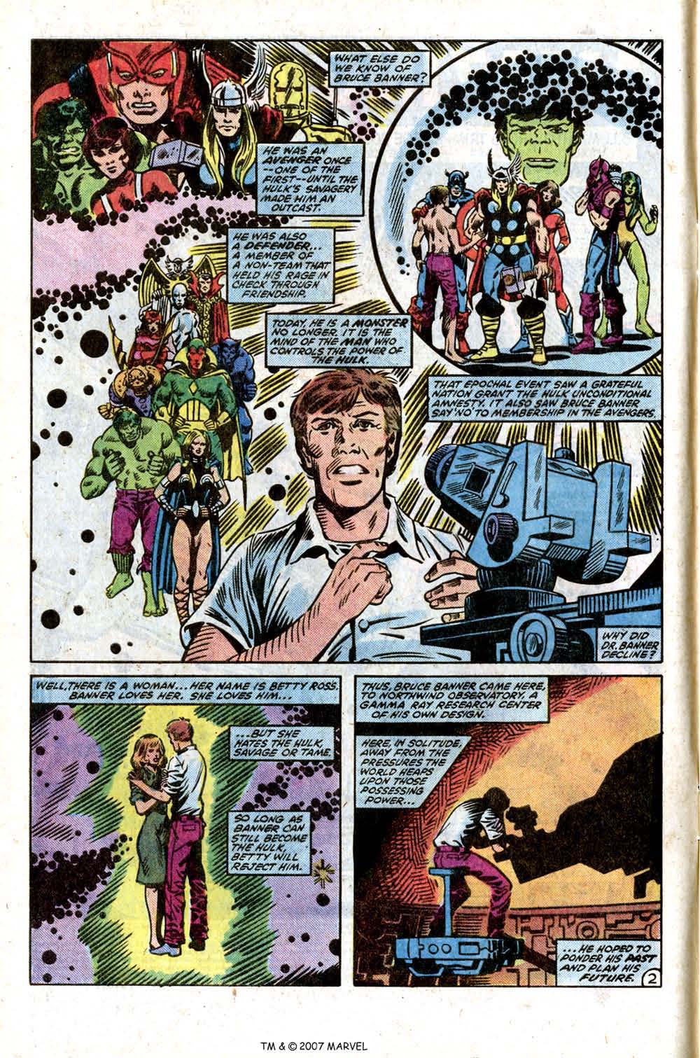 Bruce foi um VINGADOR... um dos primeiros... até a selvageria do Hulk provocar seu distanciamento do grupo. Ele também foi um DEFENSOR... membro de uma equipe oposta aos Vingadores, da qual seus selvagem alter ego foi aceito. Hoje, ele não é mais um MONSTRO. Ele é a mente do HOMEM que controla o poder do HULK. Seu alter ego finalmente recebeu o perdão presidencial devido aos seus atos heroicos... onde mesmo assim ele se recusou o posto de Vingador. A mulher que ele amou... Betty Ross... odeia seu alter ego... selvagem ou inteligente. Quando Banner finalmente conseguiu controlar o Hulk, Betty o rejeitou. Por isso, hoje Bruce Banner está aqui, no Observatório Northwind... um centro de pesquisas de raios gama construído a partir do seu ponto de vista. Aqui ele se isolou, longe das pressões do mundo daqueles que almejam a possessão do poder... eles espera deixar o PASSADO pra trás e traças os planos para seu FUTURO.