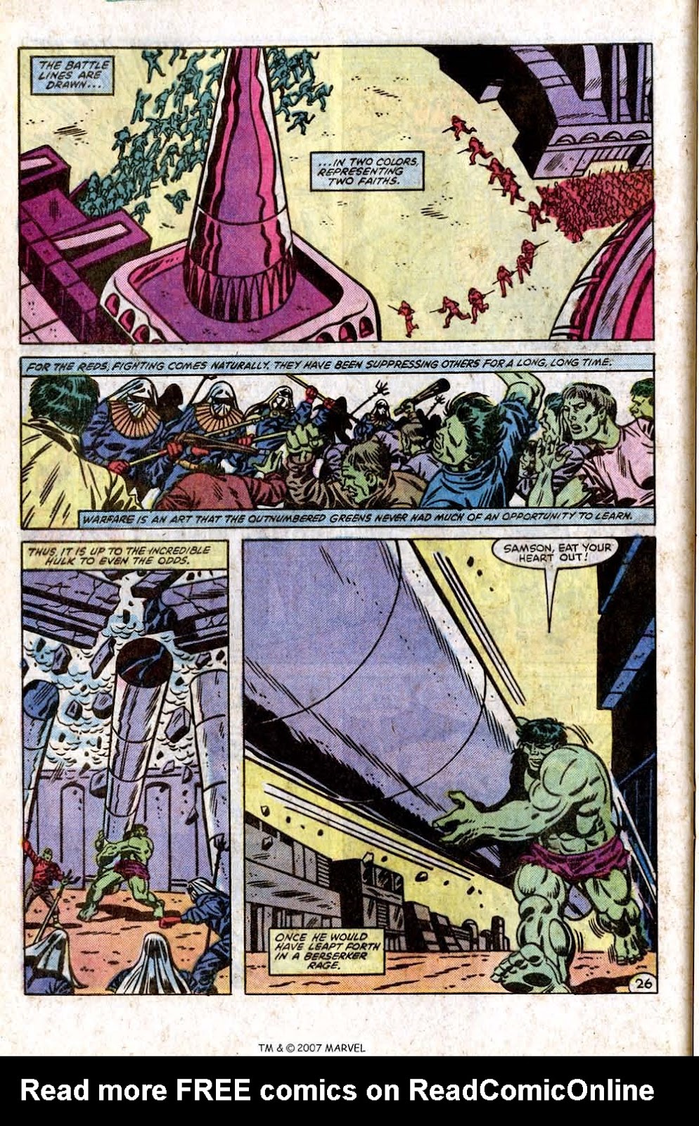 As linhas de batalha são desenhadas... em duas cores... representando duas fés. Para os vermelhos, a batalha vem naturalmente, eles suprimiram outros por um longo tempo... os verdes lutam bravamente... enquanto que cabe ao poder descomunal do incrível Hulk salvar a pátria!