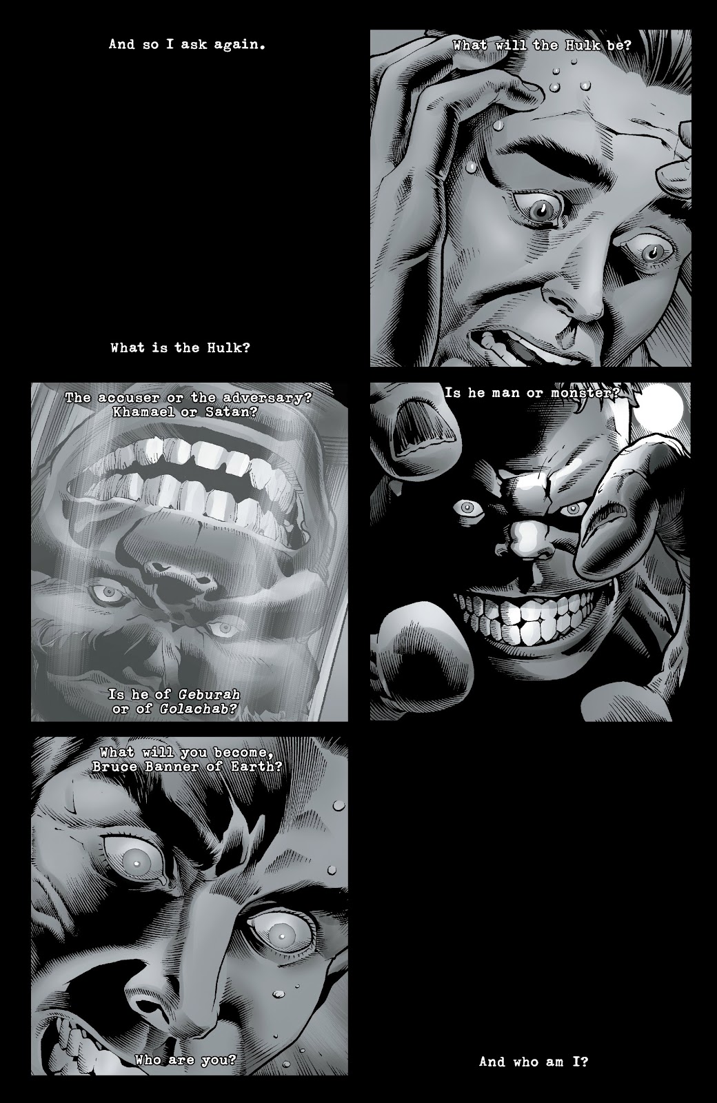 E eu pergunto novamente... o que o Hulk seria? Qual seria o Hulk? O acusador ou o adversário? Camael ou Satã? Ele seria Geburah ou Golachab? Ele é um homem ou um monstro? O que você vai se tornar... Bruce Banner da Terra? Quem é você? E quem sou EU?
