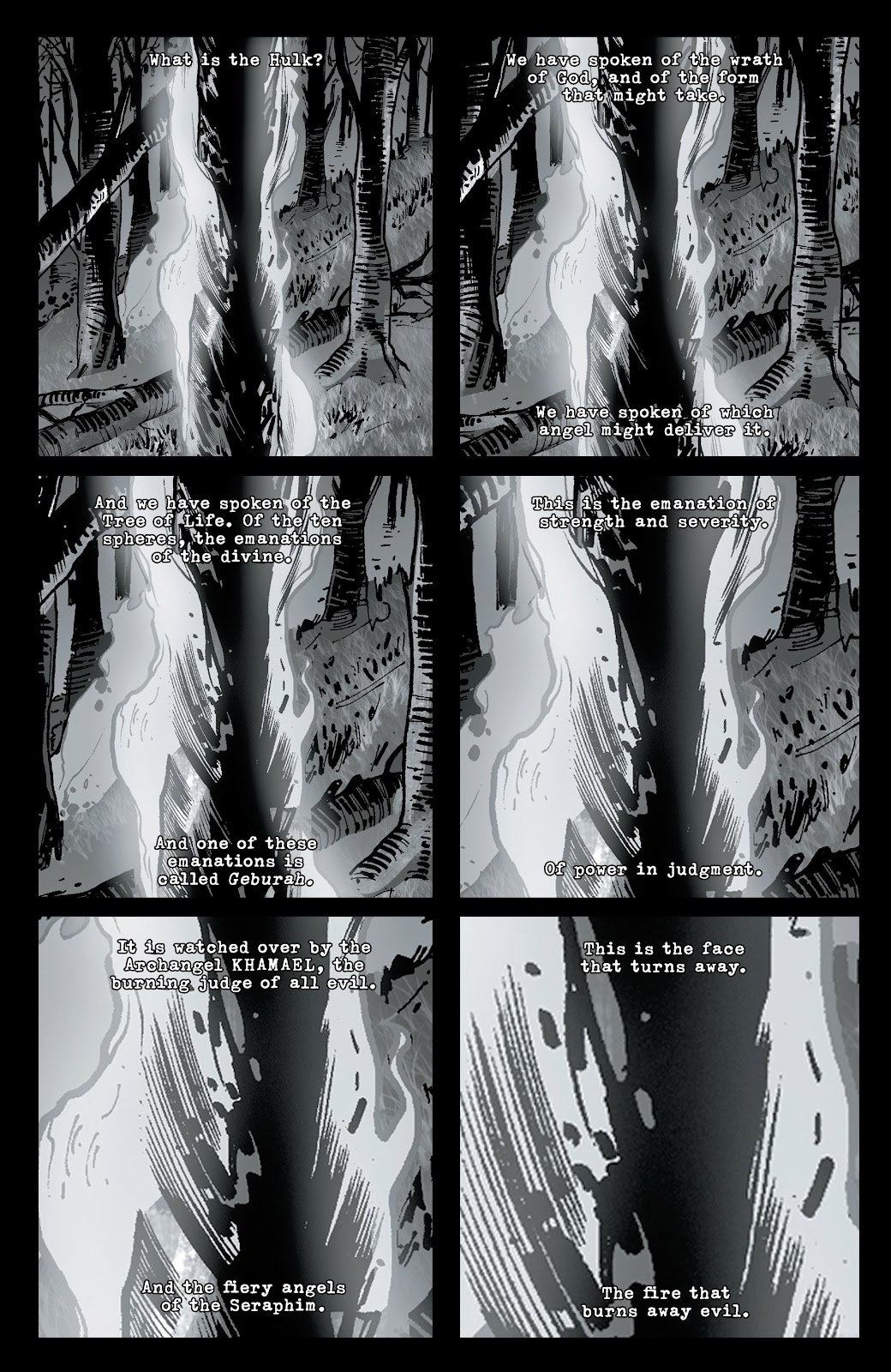O que seria o Hulk? Nós falamos sobre a ira de Deus... e da forma que pode levar. Nós falamos sobre qual anjo poderia entregá-la... e nós falamos sobre a Árvore da Vida. Das dez esferas... das emanações do divino... e uma dessas emanações é chamada de Geburah. Esta é a emanação da força e da gravidade. Do poder em julgamento... que é vigiado pelo arcanjo KHAMAEL... o juiz ardente de todo mal... e os anjos ardentes de Seraphim. Este é o rosto que se afasta... o fogo que queima o mal.