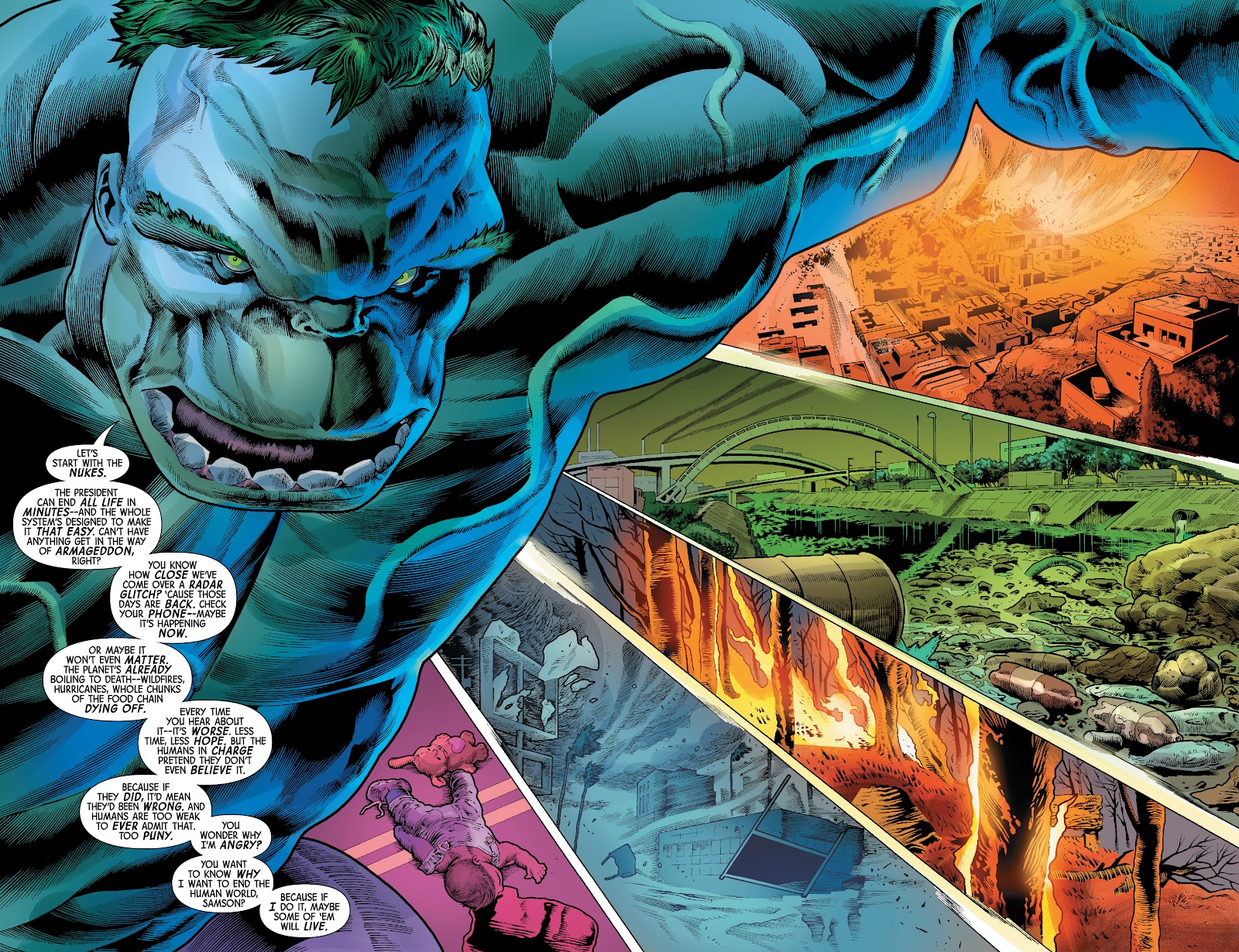 O Hulk explica para seu psiquiatra... Leonard Samson... que a única forma de consertar o mundo... é acabar com ele... dizimando boa parte parte dos humanos... e os poucos que sobreviverem será mais do que suficiente.
