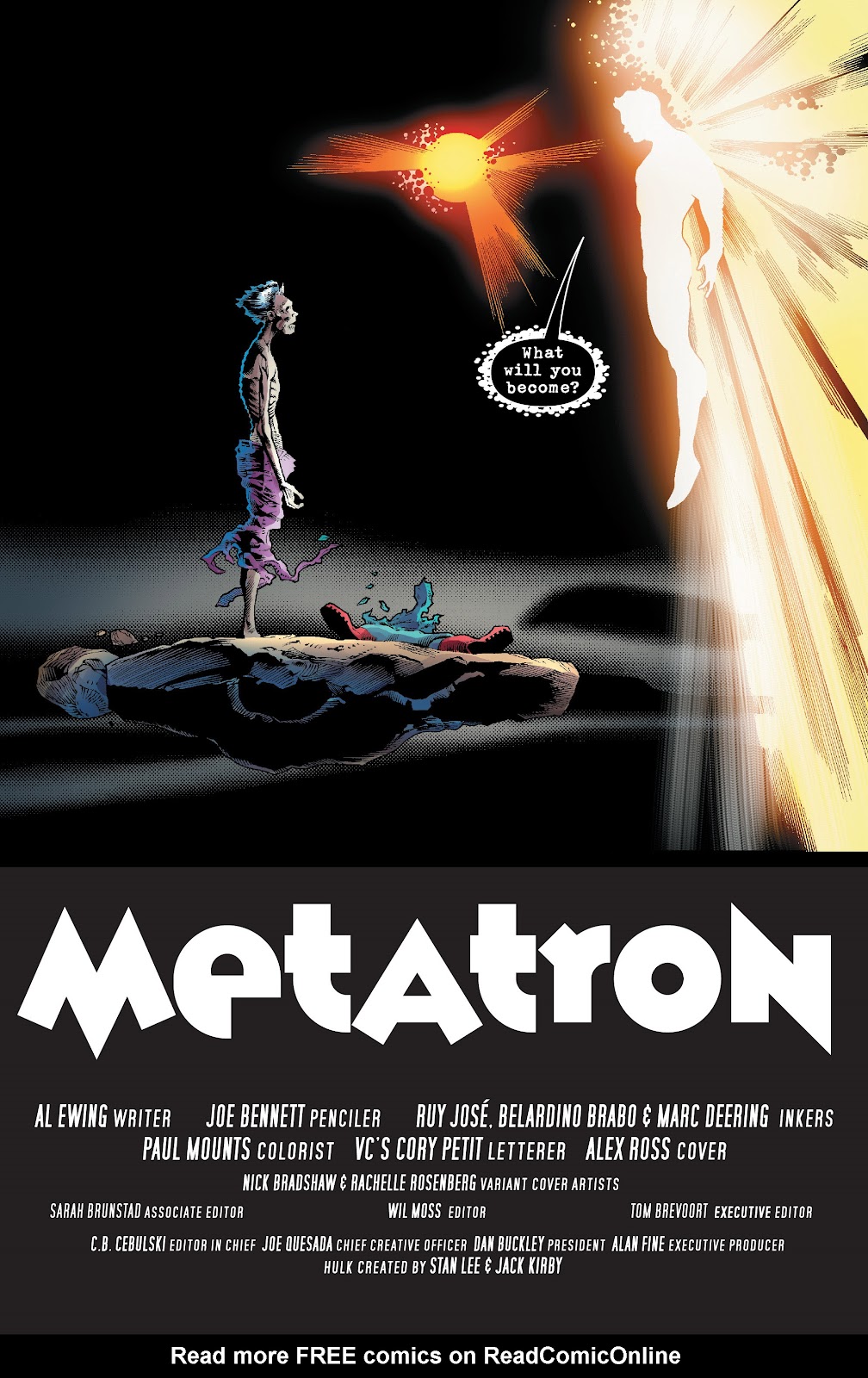 Outra edição insana de Al Ewing (roteiro)... Joe Bennett (arte) e de todo o trabalho de Ruy José / Belardino Brabo (nanquins)... Paul Mounts (cores) e capa magistral de Alex Ross. Fortean desce até o inferno dos irradiados... e ali... o Sr. Tira-Teima (no corpo de Bruce Banner) aproveita para quebrar o pescoço de um general Fortean completamente vulnerável... se tornando o novo comandante da Base Sombria. De volta ao universo distante... o ancião Banner... possuído pela entidade demoníaca que usara seu pai como hospedeiro... mata o ser dourado roubando-lhe todo o seu poder e grandeza.