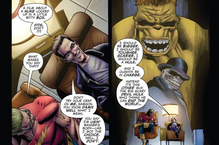 É um golpe surpreendente para Joe, mas é totalmente compreensível, pois ele tinha alguma agência no passado, mas ele simplesmente não está tendo essa chance de se expressar e de ser maior, mais difícil, mais assustador e responsável. Ele nem sequer recebeu permissão para ser um Hulk, já que tudo o que ele faz é dominar a mente de Bruce com sua inteligência de rua para ficar fora da grade. Joe está se sentindo deprimido porque ele não tem escolha. Se a situação de Fixit não for resolvida em breve, Bruce pode descobrir que ele literalmente criou seu próprio pior inimigo dentro da barriga da fera.