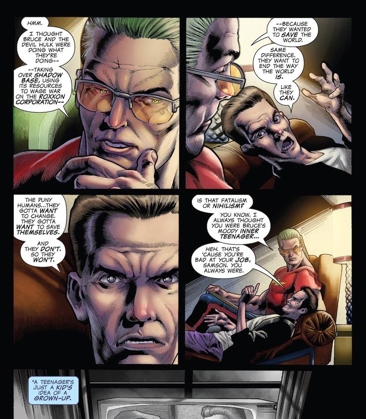 Samson ressalta que Banner e Devil Hulk estão tentando salvar a humanidade, mas Joe afirma que o plano falhará, não importa o que aconteça. Joe acha que eles não merecem esse presente e sugerem que ele pode tentar interferir no projeto. Joe claramente não gosta do Devil Hulk e acha que poderia dirigir o navio para pastos mais verdes, e está furioso por Bruce não confiar nele para infligir o caos e a purgação em primeiro lugar. Tudo isso pode estar levando a um esquema verdadeiramente maligno de Fixit.