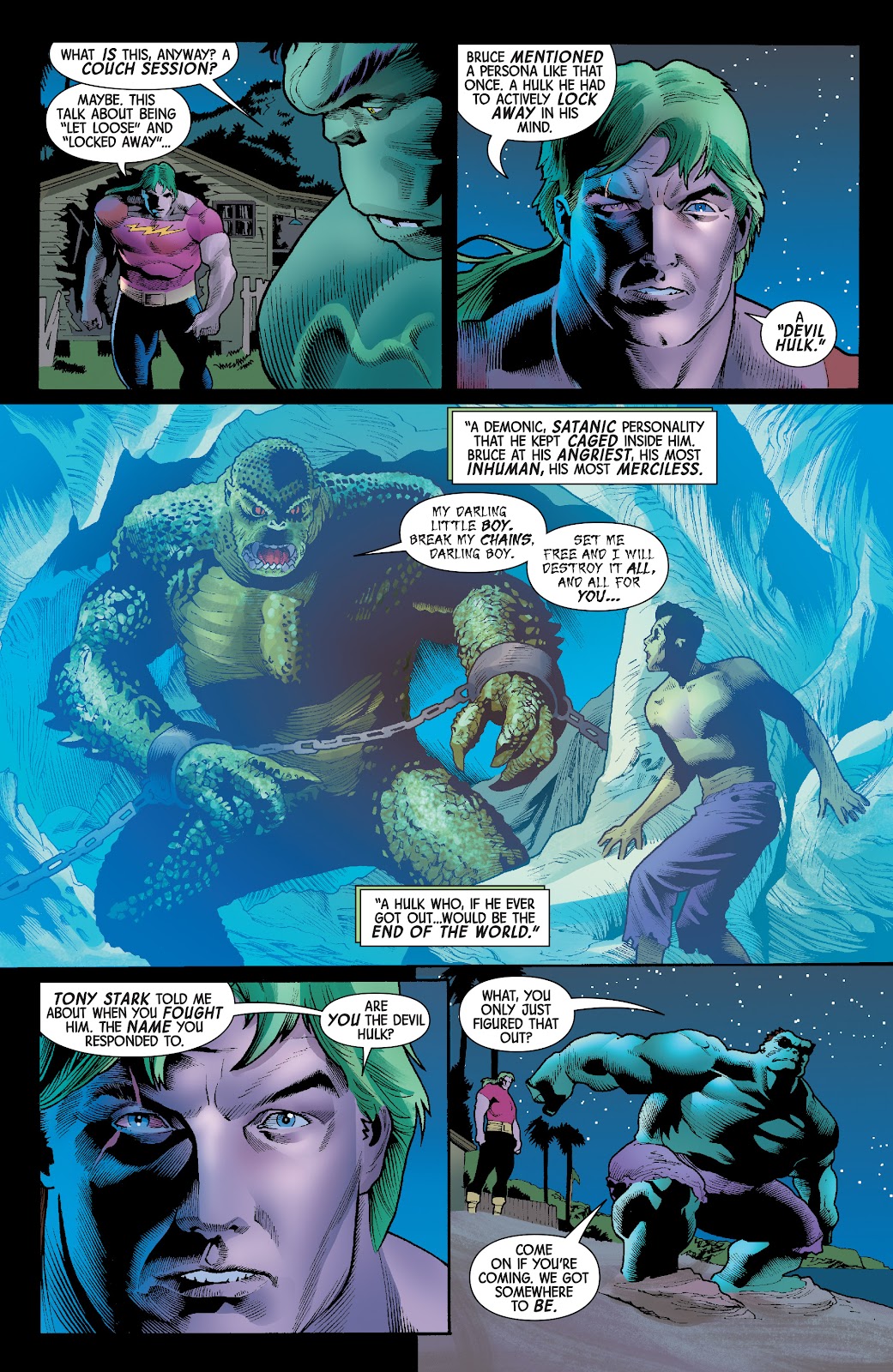 Para Bruce Banner... fazer um acordo com suas personalidades distorcidas... nunca terminara bem... dependendo da situação. É mais fácil deixar sua versão selvagem aflorar... pois ela representa toda a sua ira reprimida... enquanto que o seu demônio interior... fruto de todos os seus traumas de infância... representa a total destruição... e para se fortalecer... ele usará da fúria iminente que a versão selvagem de Banner representa... com o tinhoso chegando próximo de seus objetivos... o fim do mundo com a extinção da raça humana.