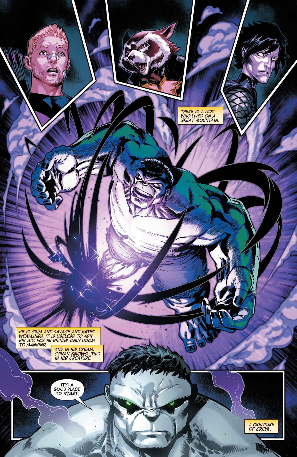 O Hulk tem em mãos um artefato precioso que lhe concederá a noite eterna... enquanto que a Feiticeira Escarlate é transportada para a Era Hiboriana... a partir de então as histórias dão uma guinada graças ao ressurgimento de Conan... lutando contra monstros gigantescos... remetendo as boas épocas de seu título "A Espada Selvagem"... aqui numa nova roupagem por parte dos roteiros de Al Ewing... Mark Waid e Jim Zub. A Feiticeira tem uma visão de um Hulk enraizado com a face de um DEMÔNIO... cujo objetivo é o FIM DO MUNDO... o FIM DA RAÇA HUMANA! Um Hulk cinza e selvagem que odeia os fracos... uma criatura que Conan acreditara ser... a criatura de CROM.