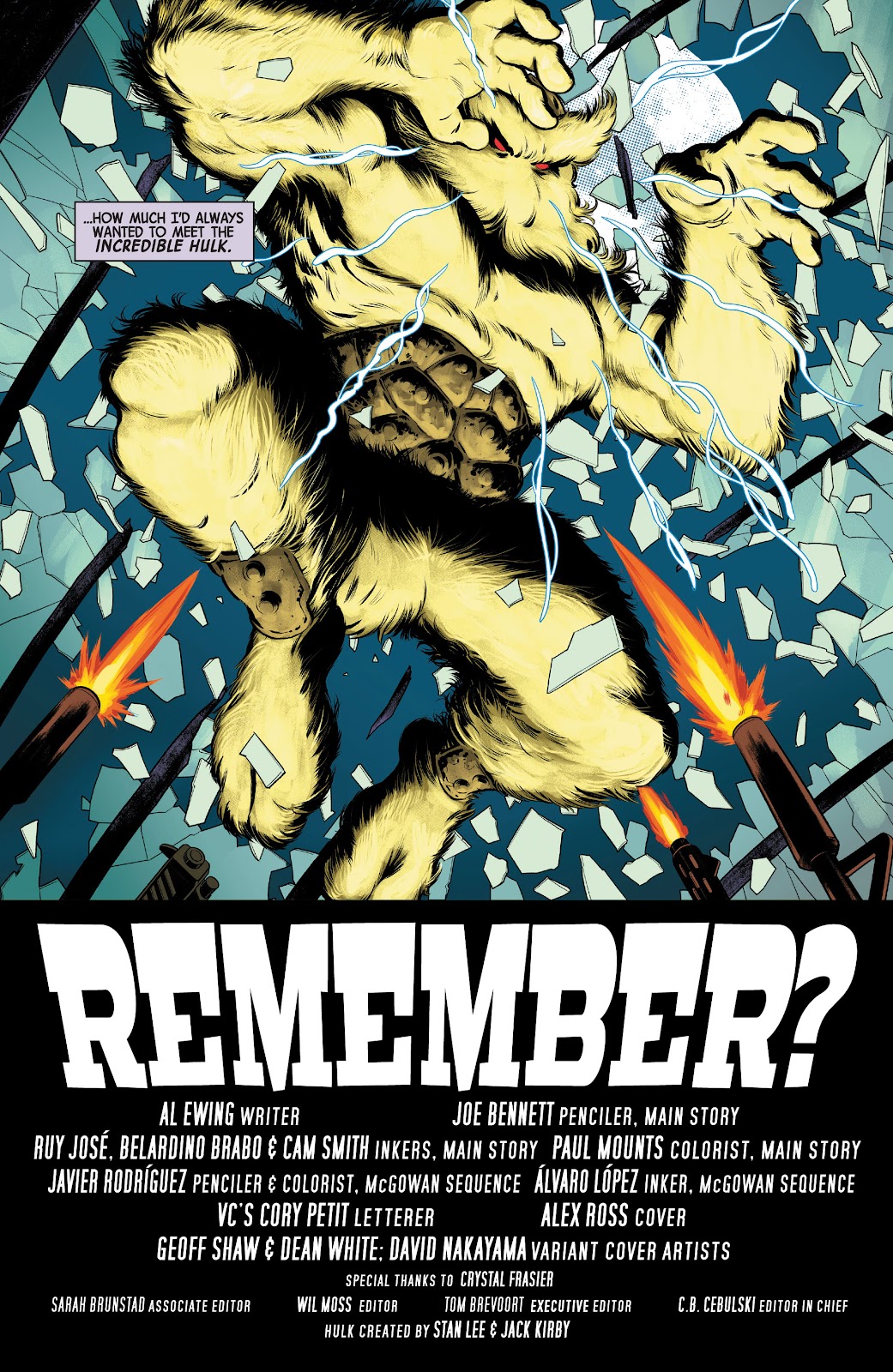 Roteiro de Al Ewing... arte de Javier Rodriguez (sequência inicial) e Joe Bennett (história principal)... nanquins de Ruy José... Belardino Brabo e Cam Smith (história principal)... cores de Javier Rodriguez (sequência inicial)... nanquins de Álvaro Lopez (sequência inicial)... cores de Paul Mounts (história principal)... letras de Vc's Cory Petit e capa de Alex Ross.