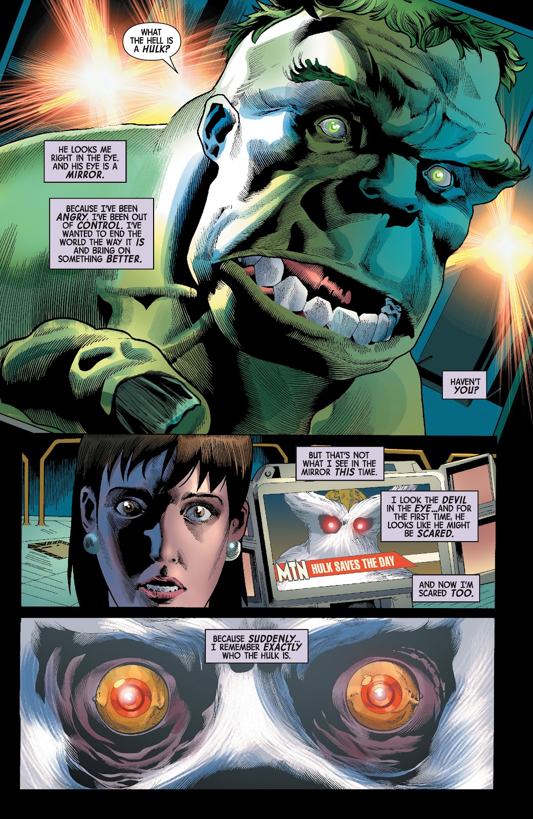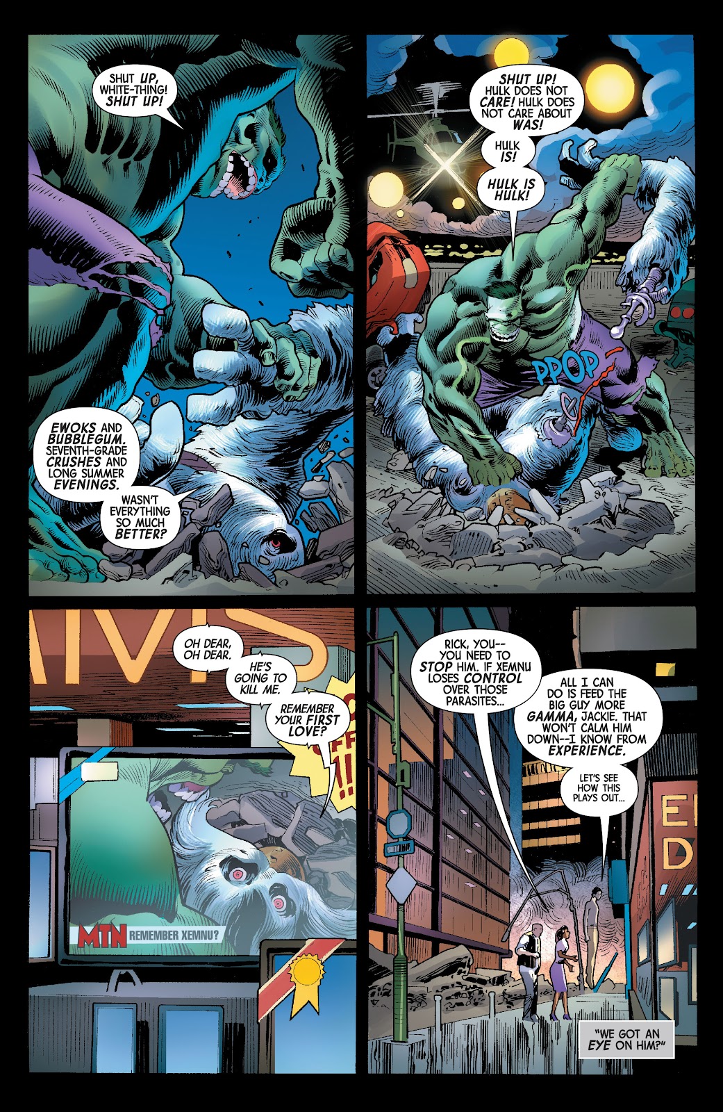 Os preparativos para o gigante verde ser incriminado por uma sociedade que sempre o odiara são feitos cautelosamente pelo escritor Al Ewing... remetendo ao período oitentista do Hulk trabalhado com maestria por Bill Mantlo... em que o golias esmeralda... mesmo com a consciência de seu alter ego... é visto como monstro por uma sociedade que teme aquilo que não conhece. Incredible Hulk #274... retratado brilhantemente pela arte do lendário Sal Buscema... mostra que o medo do desconhecido é o fator que torna o Hulk um monstro aos olhos dos mais afetados... pois não importa o que o verdão faça para ajudar seja quem for... ele sempre será visto como uma ameaça... e será impiedosamente caçado... lutando por sobrevivência estando na Terra ou em qualquer outro lugar... afinal... para o mal não existe fronteiras. O entendimento básico relacionado ao incompreendimento e o vitimismo de uma sociedade afetada... são os fatores primordiais para que o Hulk perca o equilíbrio de sua mente... e seja temido até mesmo pelas pessoas das quais permaneceram ao seu lado para o fim do mundo como nós conhecemos...e na construção de um mundo melhor. O povo cede ao controle hipnótico de Xemnu... como parte do plano da Corporação Roxxon de incriminar o Hulk... provocando uma inversão de valores. O resultado da manipulação pode ser facilmente apresentado nas imagens abaixo com a arte ainda mais hipnotizante por parte de Joe Bennett. Conseguirá Bruce Banner lidar com a distorção que o vilão provocara em sua mente?E como o Hulk reagirá perante o vitimismo de uma sociedade vitimista?