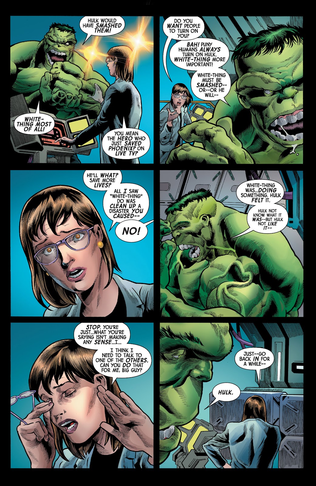 Hulk não liga pra humanos... humanos sempre vão ficar contra Hulk! Coisa-Branca fez alguma coisa com Hulk... Hulk não sabe o que ele fez... mas Hulk não GOSTA DISSO.