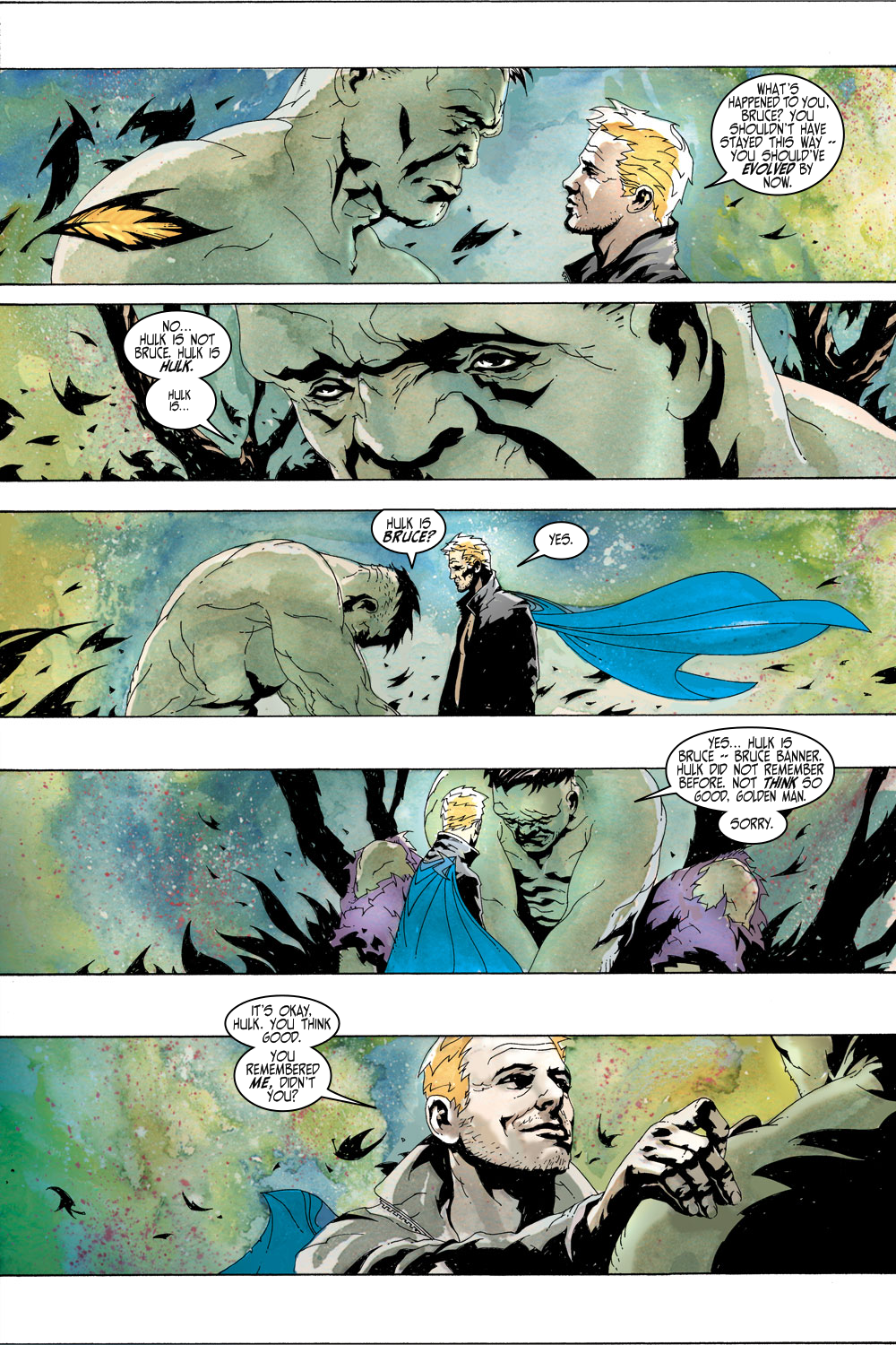 A história do Universo Marvel está sendo reescrita por um ser alienígena cujo poder provém de todas as almas tocadas por este. Ele nos faz aceitar coisas das quais confiamos... poluindo nossas mentes com a falsa nostalgia de momentos que nunca existiram. Bruce Banner é um dos afetados... e ao ser rescrito... seu objetivo é o fim do mundo... o fim da raça humana... e não o fim das injustiças (Incredible Hulk #78) como ele sempre acreditou. Acontece que tais memórias não soam falsas para Bruce... ele tem uma lembrança muito clara da raiva que sempre o consumira e até do momento em que provocou a morte de seu pai (Incredible Hulk #1) na sepultura de sua mãe. Bruce foi desprovido da culpa da morte de seu pai... ela não apenas foi causada em legítima defesa do filho... como também algo que o físico nuclear sempre quis desde o começo... e ele é livre de tudo que possa amaldiçoá-lo por conta de seu ato... como vimos em Incredible Hulk #603 e novamente em Totally Awesome Hulk #8. Talvez a verdadeira razão da qual Bruce tenha se tornado Hulk... foi para proteger o mundo do Banner. A mente de Bruce é uma perturbação total... não sabemos ao certo como tudo funciona ali... e o seu alter ego... o Hulk Verde e Selvagem... é o fruto desse estado emocional... que se encontrara vagando sem rumo na mente do cientista. Esse Hulk se tornara muito mais ingênuo com o passar dos anos... ainda mais quando ele conhecera o personagem "Sentinela" numa minissérie cujo objetivo era apresentar encontros inusitados numa continuidade retroativa. Na minissérie... Sentinela faz o verdão selvagem lembrar de que ele é Bruce Banner... que ele é ambos... Banner e Hulk... portanto o ódio que o verdão sente por Banner é em vão... pois ele estaria se odiando... ou ao menos odiando a sua parte... o instinto para sobreviver. Em Incredible Hulk #227... ao invés de vermos um Hulk Selvagem muito mais selvagem que não se conformara de ter seus sonhos assombrados por Banner... vemos no decorrer da trama algo único em se tratando dessa versão do Hulk... um verdão mais social e menos selvagem por conta de um tratamento realizado por Leonard Samson. Mas sendo uma versão selvagem e ainda desorientada dentro da mente do cientista... o verdão se torna vulnerável nesse campo... decorrente de sua raiva que de nada adiantara para compensar sua frustração... como Bill Mantlo mostrara em Incredible Hulk #264... e a sabedoria do Hulk Selvagem em Incredible Hulk #268... de que ele nunca poderá destruir Banner... porque se o Hulk morrer... Banner também morrerá. O momento de Immortal Hulk #33... em que não temos todo o brilho da perfeição da arte de Joe Bennett... gira em torno da fuga na mente de Bruce Banner... que graças ao roteiro deveras compensativo de Al Ewing... encaramos não apenas como desenhos constrangedores... mas também como algo sombrio e ao mesmo tempo estranho. E estranho é o termo apropriado para definir a esquisitice na retratação do Cicatriz Verde e do próprio Hulk Selvagem... creio que este o ponto mais baixo da HQ... e em como seria compensador caso tivéssemos a arte de Bennett... ainda mais num momento deveras importante. Orientado pelo Cicatriz Verde... o Hulk Selvagem encontra o caminho de volta na mente de Banner... ele simplesmente sai de dentro de seu alter ego num momento apoteótico ilustrado por Bennett. O Hulk parte para a Roxxon e destrói tudo que se encontra por lá... deixando seus amigos para oferecerem apoio aos civis.