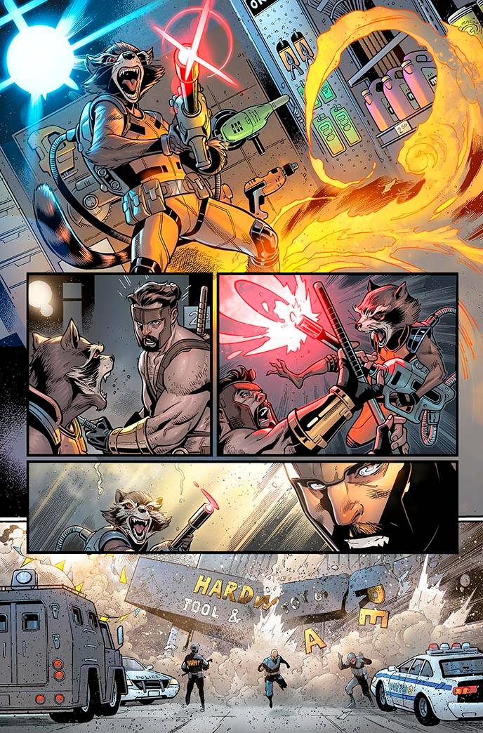 CB [Cebulski] estava na sala durante tudo isso, e ele foi inestimável em trazer um novo conjunto de olhos para todo o processo. Foi ele quem recomendou jogar uma bola curva com Rocket Raccoon, e isso funcionou incrivelmente bem. Adoro escrever o tom sarcástico de Rocket e descobrir maneiras de causar problemas.