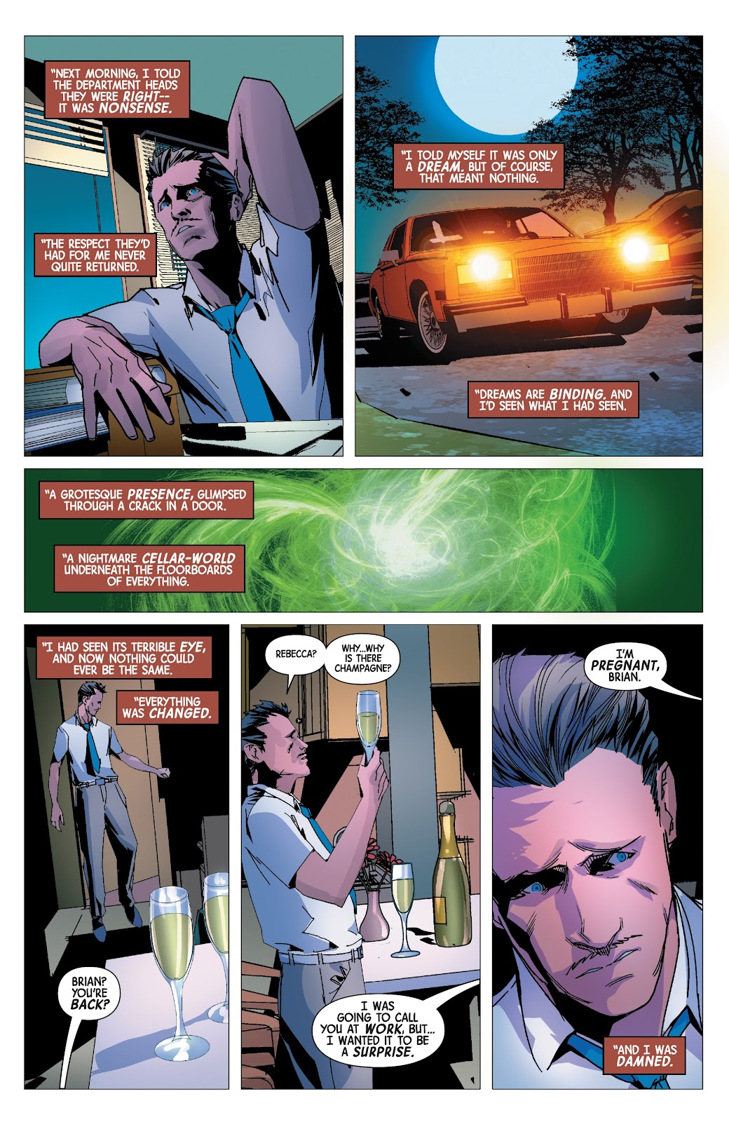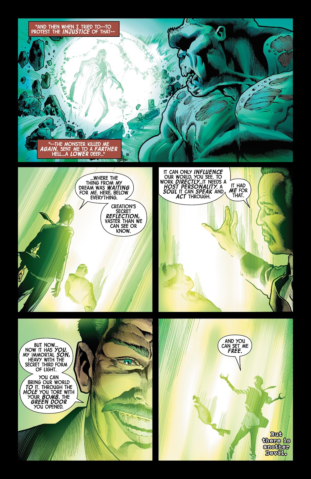 O dia em que Brian tentou protestar a INJUSTIÇA disso--o monstro o matou NOVAMENTE. Enviando-o para um inferno PROFUNDO... onde a presença nos sonhos de Brian estaria ESPERANDO por ele. Aqui... abaixo de qualquer coisa. O segredo da criação... o REFLEXO, mais vasto do que nós podemos ver ou conhecer. Isto pode unicamente INFLUENCIAR nosso mundo... para trabalhar DIRETAMENTE... necessitando da PERSONALIDADE DE UM HOSPEDEIRO... uma ALMA que possa FALAR e AGIR através. Ele precisou de Brian para isso... agora ele tem BRUCE BANNER... o FILHO imortal... com o terceiro segredo da forma da luz. Banner poderá trazer nosso mundo PARA ele. Através do BURACO que ele deixou com sua BOMBA... a PORTA VERDE que ele abriu... onde Brian pôde se LIBERTAR... mas existe outro diabo.