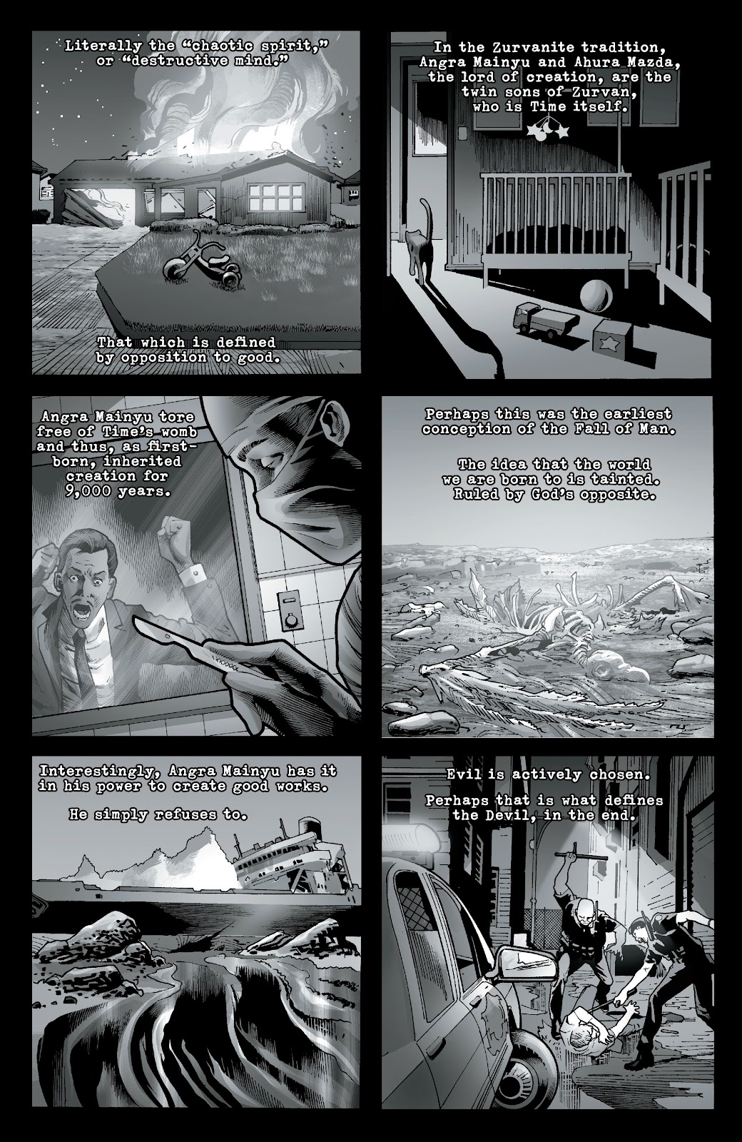 Literalmente o "espírito caótico" da mente destrutiva... o qual é definido pela oposição para o bem. Na tradição Zurvanita... Angra Mainyu e Ahura Mazda... o senhor da criação... são os filhos gêmeos de Zurvan... aquele que é o próprio tempo. Angra Mainyu rasgou o ventre do tempo e assim... um primogênito... herdaria a criação por 9.000 anos... talvez esta tenha sido a primeira concepção da Queda do Homem. A ideia que o mundo que nós nascemos estaria contaminado... governado pelo oposto de Deus. Curiosamente... Angra Mainyu tem em seu poder criar boas obras... ele simplesmente se recusa. O mal é escolhido ativamente... possivelmente talvez seja isso que define o Diabo, no final.