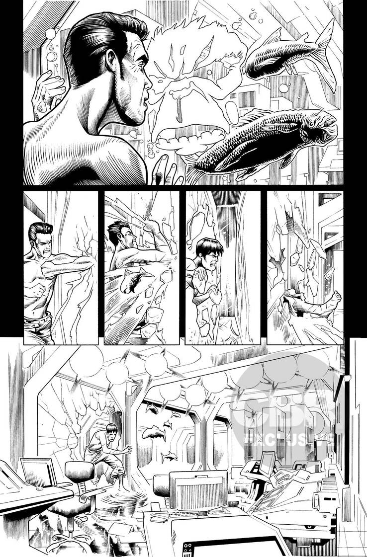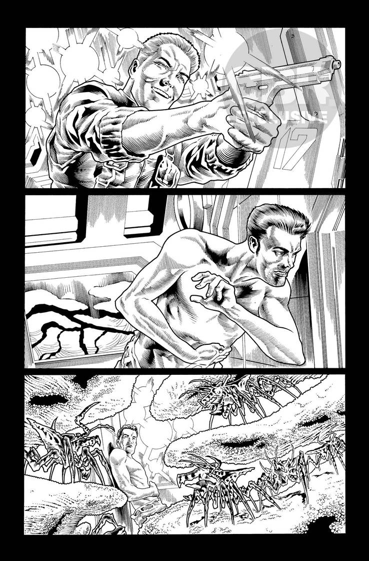Formas das quais ele influencia as histórias ... quando descobri que éramos grandes fãs de The Thing - o filme, não Ben Grimm - que praticamente fez a edição # 8 acontecer. Desde então, venho escrevendo muito mais terror corporal, e Joe tem crescido para a ocasião e me surpreendendo com novos e horríveis designs de monstros - e, é claro, isso afeta como eu escrevo esses monstros em termos de quão assustador e perturbador eles são. Tornou-se um tipo de feedback (retorno) neste ponto - estamos quase tentando superar um ao outro. O que é bom - eu odiaria que Joe ficasse entediado!