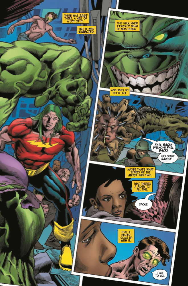 Agora, porém, Jackie está trabalhando com o Hulk porque, como ela observa, ele mudou. Ele não é o mesmo monstro que destruiu a casa deles e os deixou indigentes. Aquele era um Hulk cheio de raiva e sem direcionamento. Esse Hulk ainda está cheio de raiva, mas, talvez ainda mais aterrorizante, é uma raiva guiada - o Hulk tem um plano que Jackie ajudou a construir ... e está prestes a se unir.