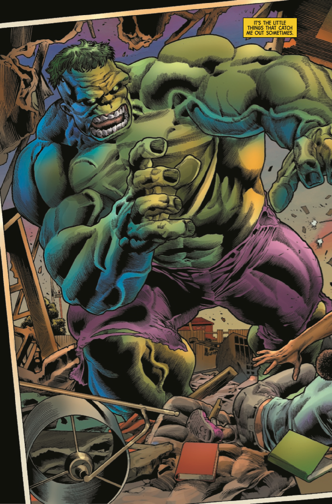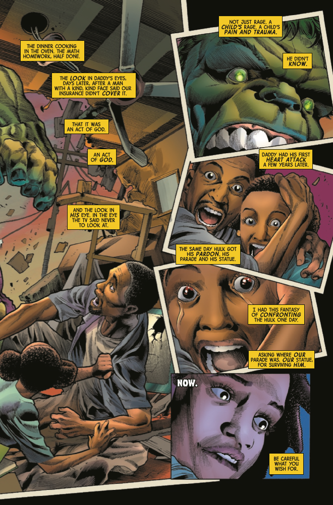 O flashback é especialmente convincente porque os resultados sangrentos dos tumultos do Hulk são abstraídos, mas aqui vemos o terror nos olhos das vítimas enquanto a monstruosidade verde destrói sua sala de estar. O leitor até ganha um pequeno epílogo - o seguro do pai de Jackie não cobriu a destruição enquanto o Hulk passou a receber perdão e uma estátua.
