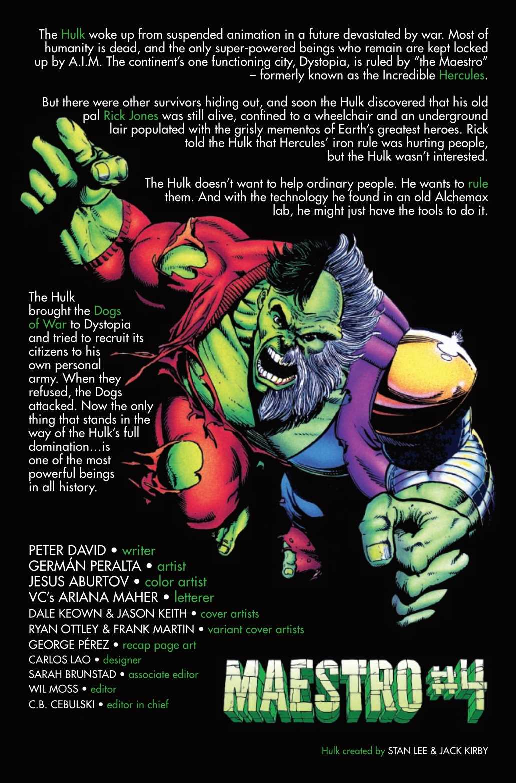 O Hulk acordou de uma animação suspensa em um futuro devastado pela guerra. A maior parte da humanidade está morta, e os únicos seres super-poderosos que permaneceram foram trancafiados pela I.M.A. (Ideias Mecânicas Avançadas). O continente em funcionamento na cidade de Distopia, é governado pelo "MAESTRO" - anteriormente conhecido como o Incrível HÉRCULES.
