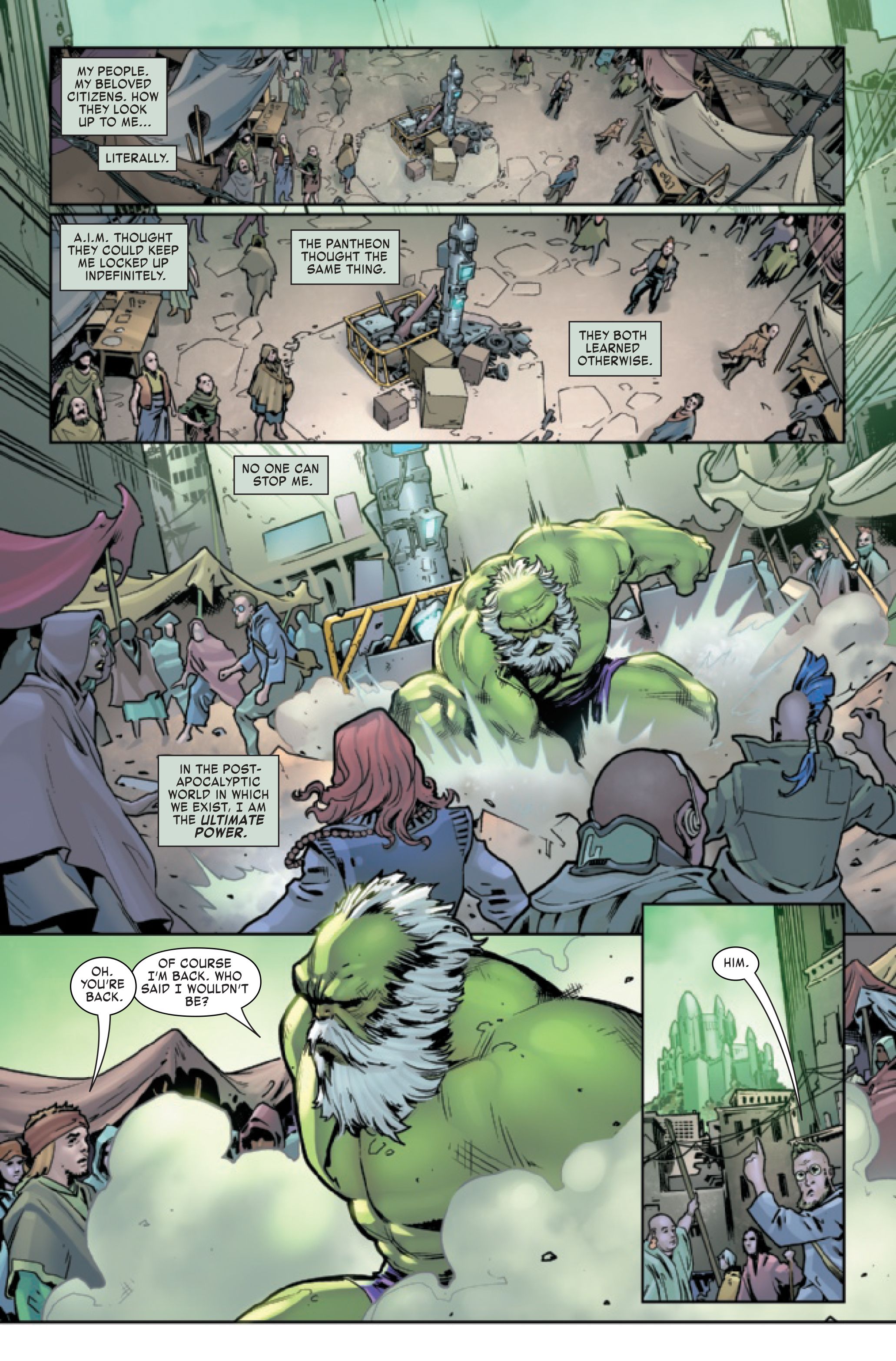 O Professor Hulk, acordara de uma animação suspensa, sendo mantido na base da I.M.A. (Ideias Mecânicas Avançadas) sob a supervisão de M.O.D.O.K., um vilão que, parece ter refletido sobre muitas coisas quando presenciara o apocalipse causado pela humanidade com suas bombas nucleares, onde boa parte dos super-heróis, perecera. O Hulk, assim como a I.M.A., foram um dos poucos sobreviventes, e o redimido M.O.D.O.K, decidira que o Professor seria a pessoa adequada para ajudar o vilão na construção de um mundo melhor, ou, reconstruir o que restara de um mundo pós-apocalíptico. Convicto de que se encontrara completamente sozinho, sem sua esposa Betty e seus amigos e aliados, o Professor, decidira que a humanidade não merecera ser salva, exceto os animais, a única forma de vida da qual ele simpatizara. Rick Jones, que sobrevivera ao apocalipse, graças a sua neta/guerreira (que permanecera ao seu lado no Universo 616), decidira assegurar a sobrevivência de uma parcela de humanos que restara. Marlo, a esposa de Rick, perecera na mira de uma arma de fogo, portanto, Rick tem apenas sua neta Janis, ao seu lado. O aliado fiel de Banner/Hulk, hoje, é apenas um velho ancião, que colecionara, em seu covil subterrâneo, os pertences de heróis já falecidos. Rick, ficara a par sobre o Professor, e decidira que ele seria a pessoa certa para proteger os humanos fracos, porém, o Hulk se tornara desiludido com a presente situação, se recusando a permanecer ao lado da I.M.A. e vendo um Hércules, que atendera sob a alcunha de Maestro, simplesmente explorando os humanos por conta de suas fraquezas. O Professor, defendera a postura de Hércules, e decidira que essa é a melhor forma de fazer a humanidade pagar. Usando de trapaça para com o filho de Zeus, o Hulk assumira o trono de Hércules, tornando-se o novo Maestro de Distopia. Rick Jones, temera que o Bruce Banner que ele conhecera, já não existira mais, e que esse Hulk, um Professor já ancião, tem o coração malévolo de seu pai abusivo, que tornara, o Hulk, uma criatura desprovida de humanidade. O Panteão, antigos aliados do Hulk, e uma equipe onde o próprio se tornara líder, ficara a par das atividades do novo Maestro, assim como outro sobrevivente do apocalipse nuclear, o Doutor Destino. O Professor, se tornara ainda mais cruel do que Hércules ao governar Distopia, sacrificando crianças e qualquer um que negar obediência ao seu governo supremo. Teorias apontam que, para que a destruição do novo governante de Distopia ocorra, é necessária a eliminação do único resquício de humanidade que lhe restara, Bruce Banner. Tomando precauções ao adentrarem na mente do Maestro, o Panteão, se certificara, de que, a paisagem dos sonhos que a equipe criara, poderia, ou não, amenizar as ações do Maestro. Mas, quando o Hulk presenciara um vídeo (arquivo) de seu pai matando brutalmente sua mãe, ele se tornara um maníaco homicida que, acabara cedendo, apenas quando seu coração amolecera com a imagem ilusória de sua mãe, como súplica angustiante, perante suas ações. O Panteão, aproveitara da vulnerabilidade do Maestro para balear Banner e mantê-lo fortemente contido. Porém, o Maestro, que exercera forte influência nos pensamentos do cientista, se tornara muito mais poderoso, decorrente da raiva interna de Bruce, ciente de que, seus velhos amigos, queriam matá-lo. O resultado, não poderia ser diferente, Atalanta, tem o pescoço quebrado pelo Maestro, mesmo numa súplica por um dos membros do Panteão, para que ele não a matasse, mas, quando ameaçado, o Maestro se tornara desprovido de humanidade. No fim, o Panteão, permanecera com o corpo de Atalanta, enquanto eles permanecem juntos quando se autodestroem, lançando um último ataque contra a base da A.I.M., sob a ordem do Maestro.