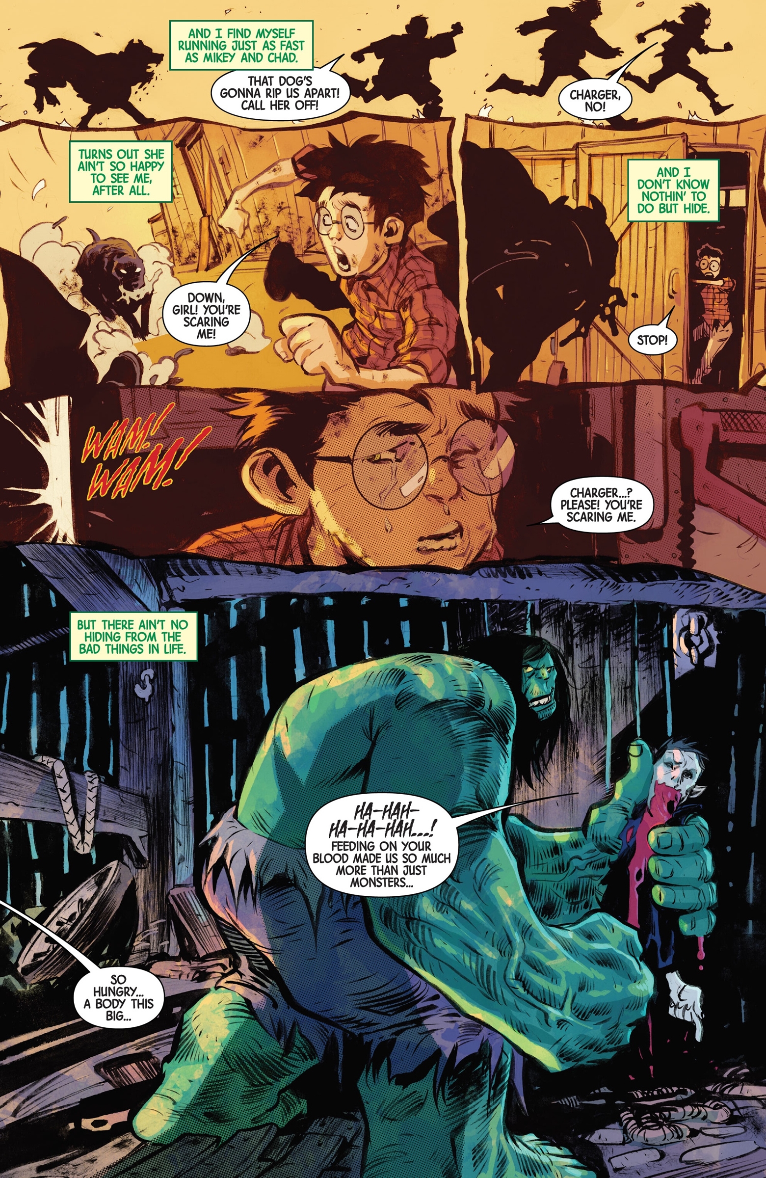 Por mais incrível que pareça, e aqui o "Incrível" em nada tem a ver com o Hulk, a Marvel foi coerente com os 3% dos seus leitores, já que a qualidade cartuneca/infantiloide por parte dos desenhos de Pepe Larraz, é o que se seguiu nas demais publicações relacionadas com o evento 'Blood Hunt'. Com o evento principal, muitos desenhistas alternativos aproveitaram para fazer os seus piores trabalhos nos quadrinhos. A qualidade pitoresca de 'Blood Hunters' #2 é absurdamente surreal... na primeira história relacionada ao Hulk, tudo começa com um flashback no qual Bruce Banner precisa lutar por sobrevivência, "mate ou seja morto" seria o título perfeito para a história. Banner está ciente de que quanto mais ele acredita estar fazendo o certo, mais problemas ele atrai. De um modo geral, conforme o que está sendo estabelecido na fase woke do Incrível Hulk, isso seria perfeito para que um novo Bruce Banner na visão de Phillip Kennedy Johnson & Johnson's renascesse em prol do amor.